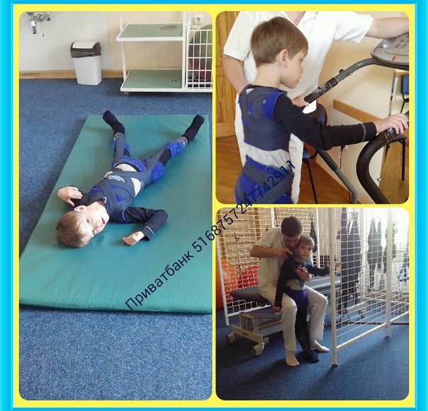 ЛФК и занятия в костюме-спирали (с каждым разом усложняются- теперь добавили и ходьбу по беговой дорожке).