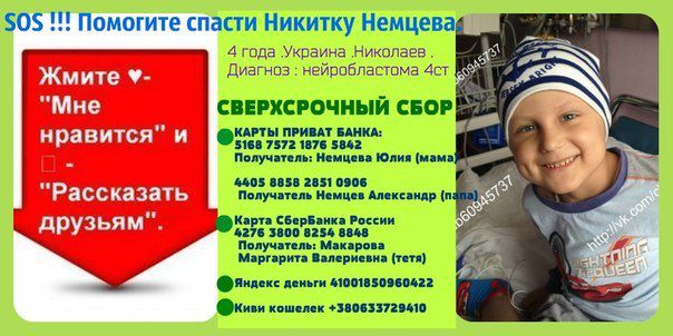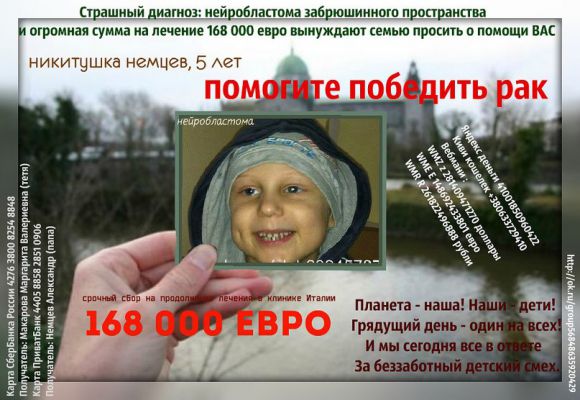 Хотелось бы уточнить что,все вырученные средства в рамках мероприятия,пойдут на лечение Никиты Немцева. Недавно Никитке поставили диагноз НЕЙРОБЛАСТОМА 4 стадии Болезнь очень редкая и встречается только у детей (злокачественная опухоль , метастазы в костном мозге)