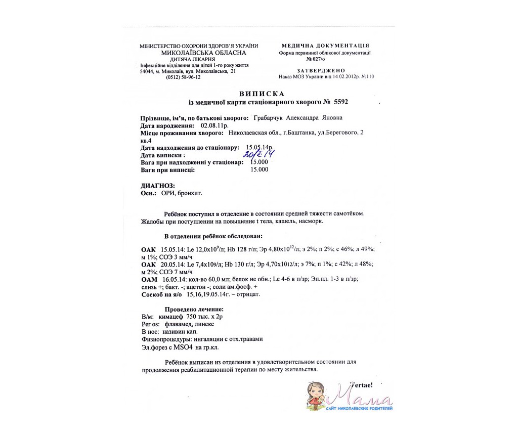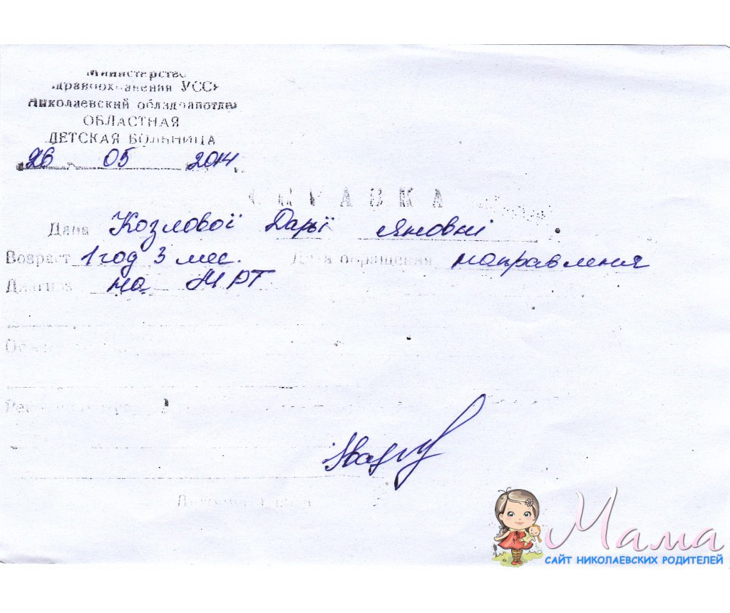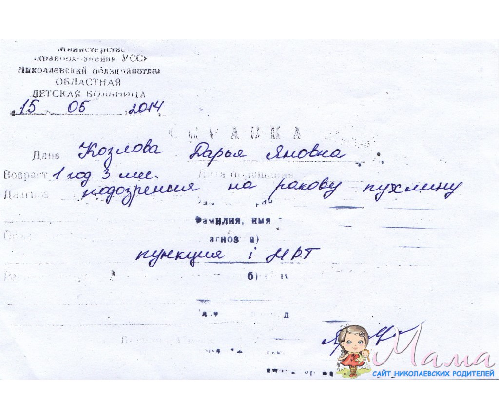 Здравствуйте мои дорогие. Сегодня наших девочек выписали. Я ее провела и посадила на маршрутку в Баштанку. Будем ждать их теперь в понедельник на МРТ. Долго я собиралась с мыслями как написать и что написать в нашей темке, поскольку получила на руки справочки от врача в которой написано что у Даши подозрение на раковую опухоль. До сих пор я в шоковом состоянии. Будем теперь ждать результаты пунции и держать кулачки и молиться. Загружаю отсканированные выписки из больницы и справочки от врача.