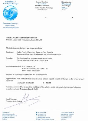 К сожалению на МРТ диагноз подтвердился ( тяжелая кистозная енцифалопатия головного мозга). Но там нам убрали диагноз симптоматическая эпилепсия. Это обследование нам стоило с визами 40 000 тысяч гривен ( 4000 евро) потому что первый раз мы вынуждены были ехать через фирму представителя клиники. В сентябре мы поехали в Бельгию на таматис терапию в клинику Атлантис . это нам обошлось в 2000 евро. Туда нужно ездить каждые 2-3 месяца.