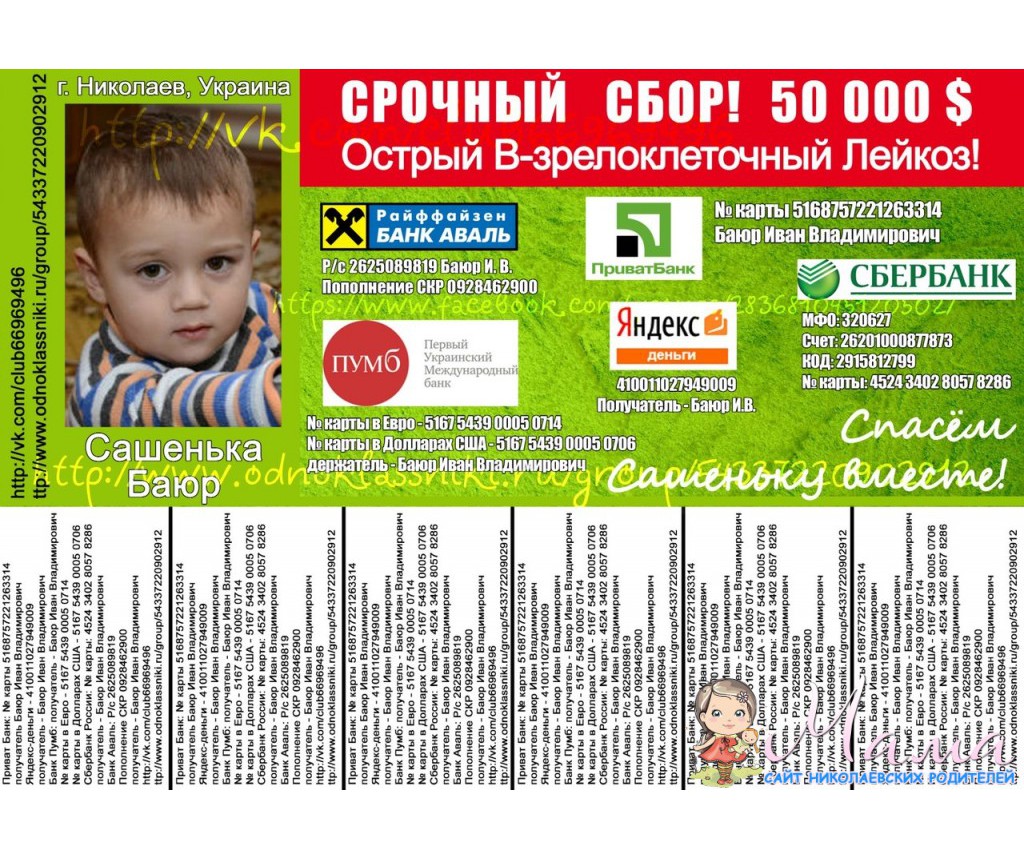 История Сашеньки- Баюр Александр Иванович, 4 годика, Николаев, Украина. Диагноз: Острый В-зрелоклеточный лейкоз, ФАБ-вариант L3. Ребенок поступил в приемно-диагностическое отделение областной детской больницы г. Николаева 21.01.2014 г. 16.01.14 консультация ортопеда ОДБ. Реактивный артрит. 17.01.14 консультация кардиолога, Дз: Кардиопатия т/и генеза. 30.01.14 консультация пульмонолога, Дз: ОРВИ, острый ринофарингит. О. бронхит. 03.02.14. консультация иммунологом, Дз: Вторичный иммунодефицит. 07.02.14 консультация хирургом, Дз: Острый левосторонний шейный лимфаденит. Состояние не улучшалось, сохранялась температура 38-39, боли в правом тазобедренном суставе. 21.01.14 сильные боли в спине, не мог встать с кровати. Увеличение лимфоузлов слева подчелюстных. 21.01.14 Обратились в ОДБ, госпитализирован в ПЖО ОДБ, где лечился с 21.01.14. Диагноз: реактивный артрит правого тазобедренного сустава. Кардиопатия т.и генеза. ОРВИ. Реактивная лимфоденопатия. С 24.01.14 - 06.02.14 лечение в ортопедотравматологическом отделении ОДБ. Диагноз: Реактивный артрит правого тазобедренного сустава, шейно-подчелюстной лимфаденит, находится на вытяжке с 21.01.14 - 09.02.14. Состояние без улучшения. Сохраняется гипертермия, боли в правом тазобедренном суставе исчезли, боли в левой ноге и руке с 09.0214. Выраженный лимфаденитшейно-подчелюстной слева в виде конгломерата: 10-х-17см, в количестве 5-6шт, справа одиночные лимфоузлы до 1 - 1,5см. 06.02.14 переведен в иммуно - инфекционное отделение ОДБ с 06.02.14 - 17.02.14, где лечился по поводу. Диагноз: Ветряная оспа, типичная форма, среднетяжелое течение. Гипертермический синдром. Острый левосторонний лимфаденит шейно - подчелюстной. 08.02.14 Ветряная оспа температура 39, везикулопапулезная сыпь на голове, туловище. С 10.02.14 сыпь на конечностях. Осмотрен онкологом, рекомендовано перевод в онко - гематологическое отделение после излечения ветряной оспы. 17.02.14 Переведен в ОГО. Диагноз: О. лейкоз.