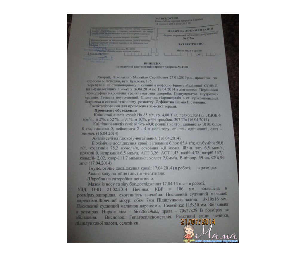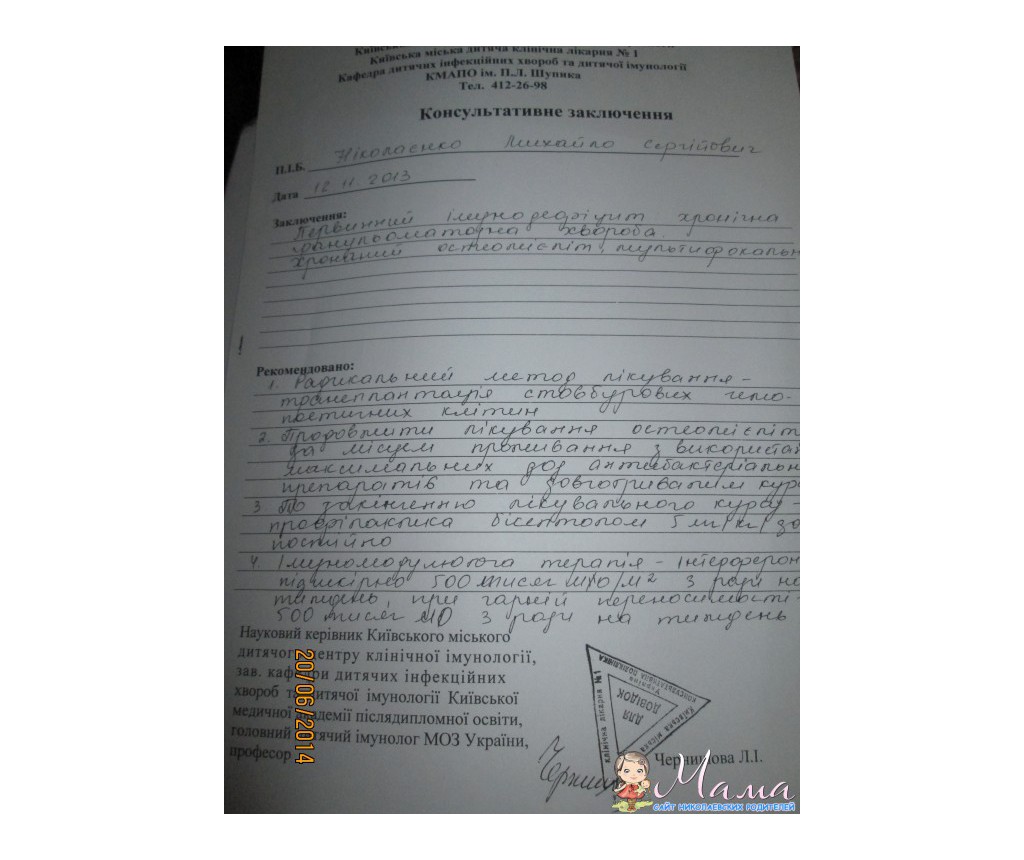 Беременность протекала хорошо.Родился Миша в срок - вес 3380кг,рост - 52 см,но родился уже с прыщиками,их было не много.Врачи приписали смазывать синькой на водном растворе,но после этого прыщи обсыпали малыша всего.На 4 день нас с Мишей отправляют в Сумскую областную детскую клиническую больницу,в отделение патологии новорожденных.В Сумах врачи поставили диагноз : визикулез. Лечили антибиотиками и смазывали Мишу зеленкой.Через неделю все прошло,готовили выписку,но у малыша снова появилась другая сыпь это уже была какая то гепретическая инфекция,и все началось сначала.......Но слава Богу и это тоже прошло!Через 21 день нас выписали домой.Малиш вел себя нормально........Где то через 3 недели мы заметили у Миши на шее воспаленные лимфоузлы,и снова поехали в СОДКЛ,теперь уже в хирургию.Там поставили диагноз : острый гнойный лимфаденит.Сделали пункцию и врачи сказали ,что нужно оперировать.Операция прошла хорошо,лечили опять же антибиотиками и делали перевязки.Через неделю нас выписали,все зажило,но прошло не мало времени как мы с Мишей едим опять в больницу,снова в хирургию.ставят диагноз :острый гематогенный остеомиелит правой пяточной кости.Пришлось снова оперировать,лечить антибиотиками,но уже пришлось ставить катетер подключичный(но 5 раз меняли).Ножка не как не заживала,оперировали много раз,а потом еще обнаружили,что лимфоузел который оперировали тоже воспалился и на правой ручке начался остеомиелит лучевой кости.Сдавали много анализов,и много раз на туберкулез костей.............с этим диагнозом (под вопросом) отправляют в Киев,в ОХМАТДЕТ в отделение гнойной хирургии.В ОХМАТДЕТЕ Мише делают КТ и много разных анализов..........и врачи говорят,что у него еще и остеомиелит правой лопатки..............Лечение назначали максимальные дозы антибиотиков и противогрибковых препаратов,иммуноглобулин Биовен-моно.Диагноз : СЕПСИС!!И снова не одна операция .Там же в ОХМАТДЕТЕ Миша заболел гриппом и на фоне высокой температуры у малыша пошли судороги,но слава Богу все обошлось.Мы пролежали еще месяц и готовят нас на выписку домой,но приходят плохие анализы печени, трансаминазы 1000 и нас направляют с Киева на Сумы в СОДКЛ,в хирургию.Пролежав 10 дней нас выписали домой в хорошом состоянии,малышу было 6 месяцев,игрался,что-то агукал,улыбался.Назначили лечение на дом.Проходит 2 недели и у Миши воспаляется лимфоузел в паху,снова СОДКЛ,хирургия............была операция,но на этот раз лимфоузел удалили полностью и сдали на аназин в Туб.диспансер.Анализ негативный,туберкулеза нет.Через неделю у малыша поднимается температура до 38.5 и не проходит долго,нас переводят в инфекционное отделение,под подозрением на грипп.Собирали много раз косилиум ,но врачи не могут понять что за диагноз.На то время Мише было 7 месяцев но он не сидел,зубов не было,направляют до невропатолог,диагноз - гидроцефалия.приписали таблетки - диакарб и аспаркам. .Проходит время и у Миши воспаляется правый пяточный остеомиелит и теперь уже левая ручка - тоже остеомиелит.Переводят в ОХМАТДЕТ,в гнойную хирургию,там ставят диагноз : первичный иммунодефицит и хроническая гранулематозная болезнь,токсичевкий гепатит,наружная гидроцефалия ,хроносепсис,хронический остеомиелит,варикоз вен на шее.Мише ставят теперь катетер в бедренную вену и максимальная доза антибиотиков и противогрибковый.противобактер