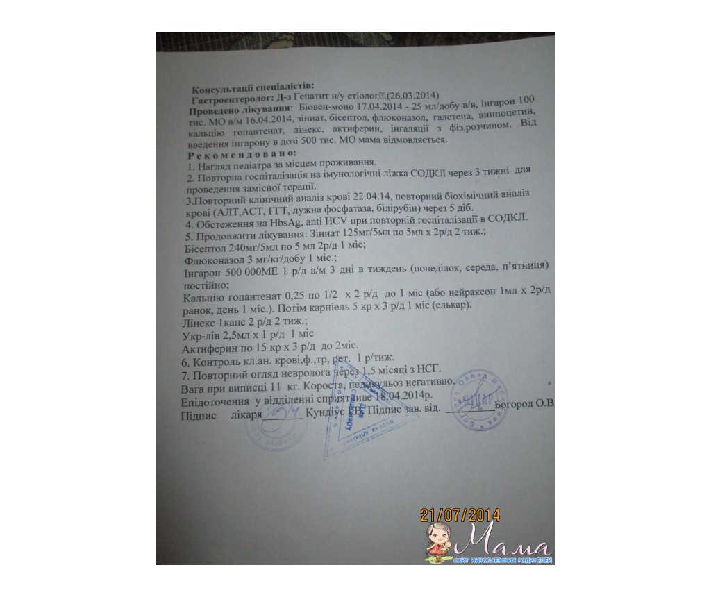 Малыш постоянно на лекарствах: бисептол,флюконазол,урсофальк,иммуноглобулин "Биовен-моно",диакарб,аспакрам,лопкарс,ингарон,кальций гопантенат.Мы с малышом целый год были по больницам,то Сумы,то Киев "ОХМАТДЕТ".Сейчас,слава Богу,дома,но каждый месяц ездим на иммуноглобулин,и каждую неделю сдаем анализы.