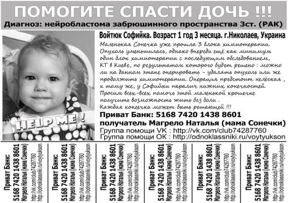 02 November 2014 Огромная просьба ко всем у кого есть принтер или МФУ помочь напечатать и распространить листовки о Софийке!!! Прикрепленный файл подходит для печати на листе А4 на обычном принтере или МФУ. Спасибо ВСЕМ-ВСЕМ кто не пожалеет своего свободного времени ради спасения жизни ребенка!!!!
