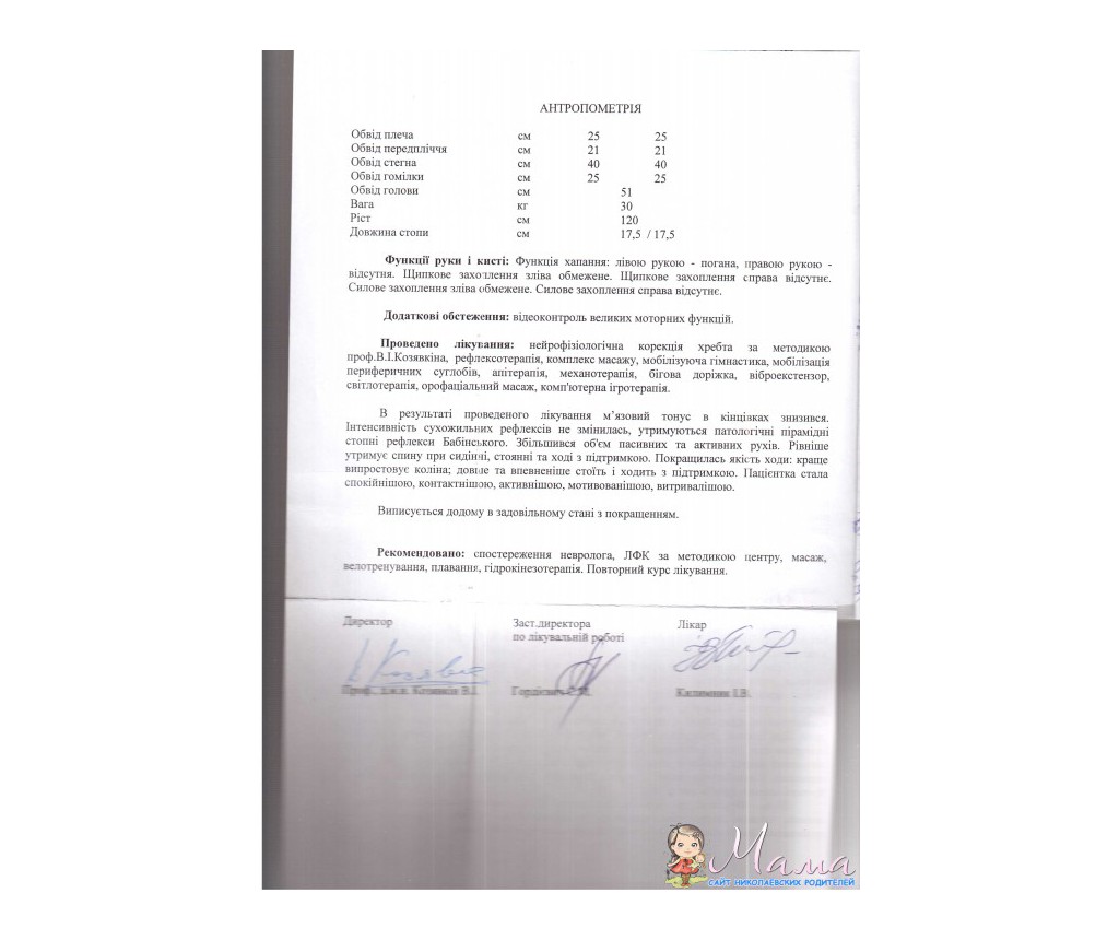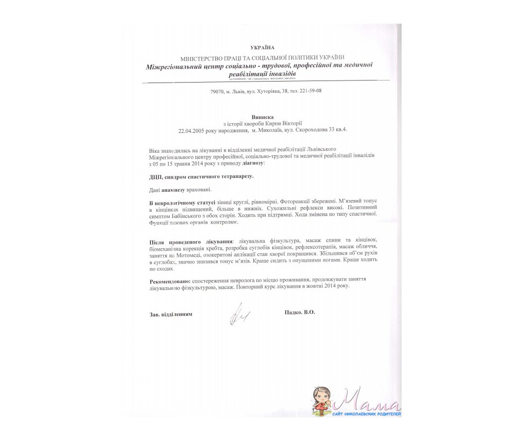 Я, мама прекрасной доченьки Виктории, которая родилась 22 апреля 2005 г. Роды были долгими и тяжелыми, врачи изначально сказали что: «Плод с роддома вы не заберете, так как максимум он будет весить 900 грам". Ребенок родился раньше времени, на 7 месяце, весом 2,250 ростом 44 см, 5-6 балов по шкале АПГАР. В пятницу 22 апреля 2005 года в 12:30 ее выдавили, забрали в реанимацию, а в понедельник 25 апреля 2005 года уже спустили в отделение патологии. Три недели пролежали в больнице, врачи, выписывая ничего, не сказали, что будут какие-то проблемы.