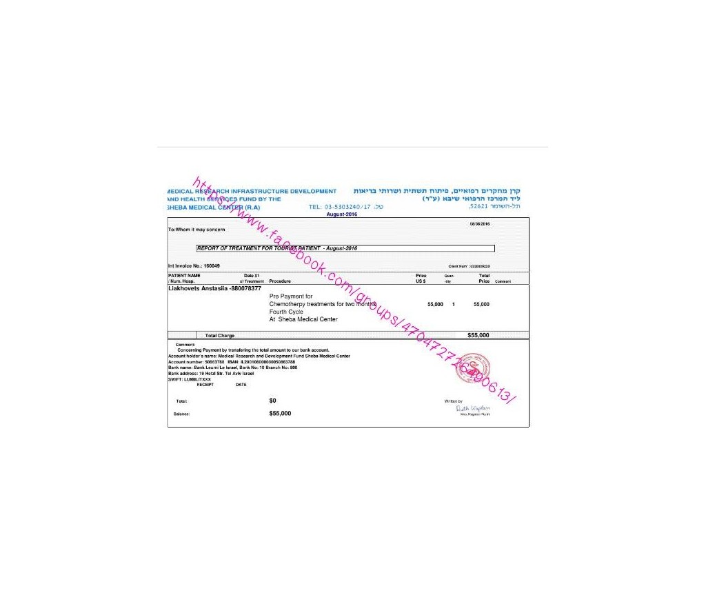 Настенька проходит лечение в клинике Шиба Израиль. После долгих исследований ей начали лечение химиотерапией. Для лечения Настеньки в клинике семье были ранее выставлены два счета в 100 000 $ и 90 200 $ (сумма вместо с доп. Расходами), данных сумм оказалось недостаточно на лечение, в связи с высокими затратами денег помимо непосредственного лечения, деньги уходят на госпитализацию, реанимацию, сдачу анализов и прочие непредвиденные растраты. Из-за значительного количества незапланированных затрат, к сожалению, нам не хватит последнего счета для оплаты лечения Настеньки Мы получили дополнительный счёт на сумму 55 тыс. долларов. Также в сбор будет включены дополнительные расходы на аренду квартиры, которая составляет 1700 $ (оплата Ноябрь), т.к. 4-й блок рассчитан на 50 дней и лечение Настеньки затягивается из-за возраста и побочных эффектов лечения, закончить курс химиотерапии не удастся в указанный срок. Питание, связь и дополнительные мелкие расходы мы оплачиваем сами. Общая сумма дополнительного сбора 56.700 $. Остаток от предыдущего сбора 11,441$ осталось на 08.08.2016 45,269 $