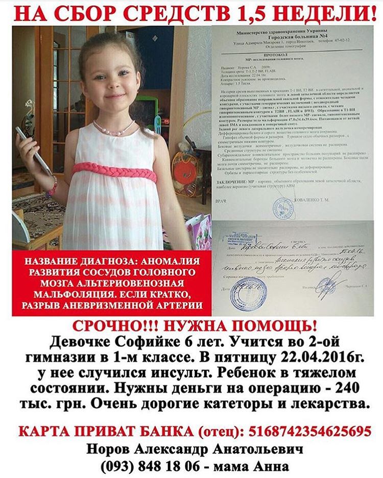 СТОП СБОР!!! Срочно! Помогите малышке 6 лет - инсульт!!! Маленькой Софийке нужна помощь! Требуется дорогостоящая операция в Киеве, мало времени на сбор!!!