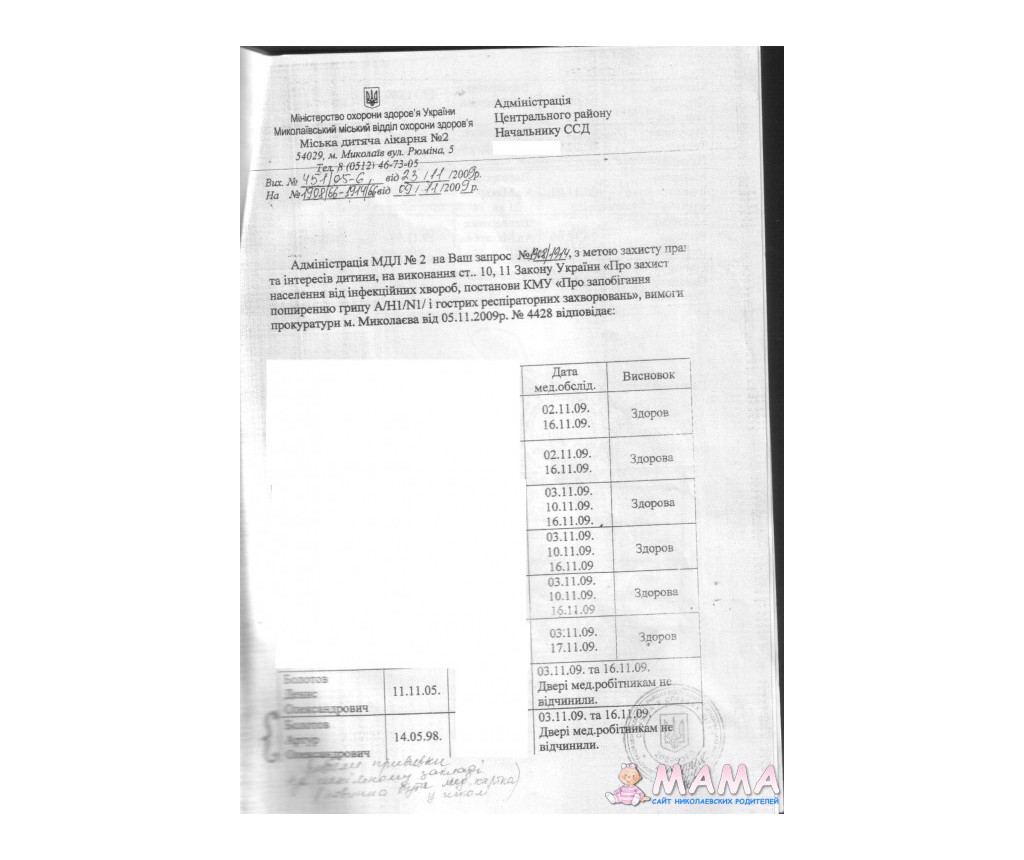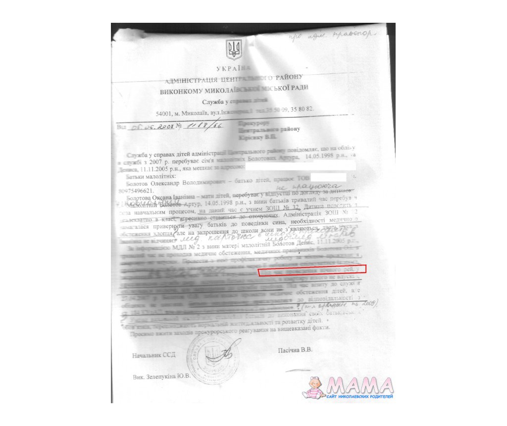 Вот обращение к начальнику службы по делам детей г. Николаева