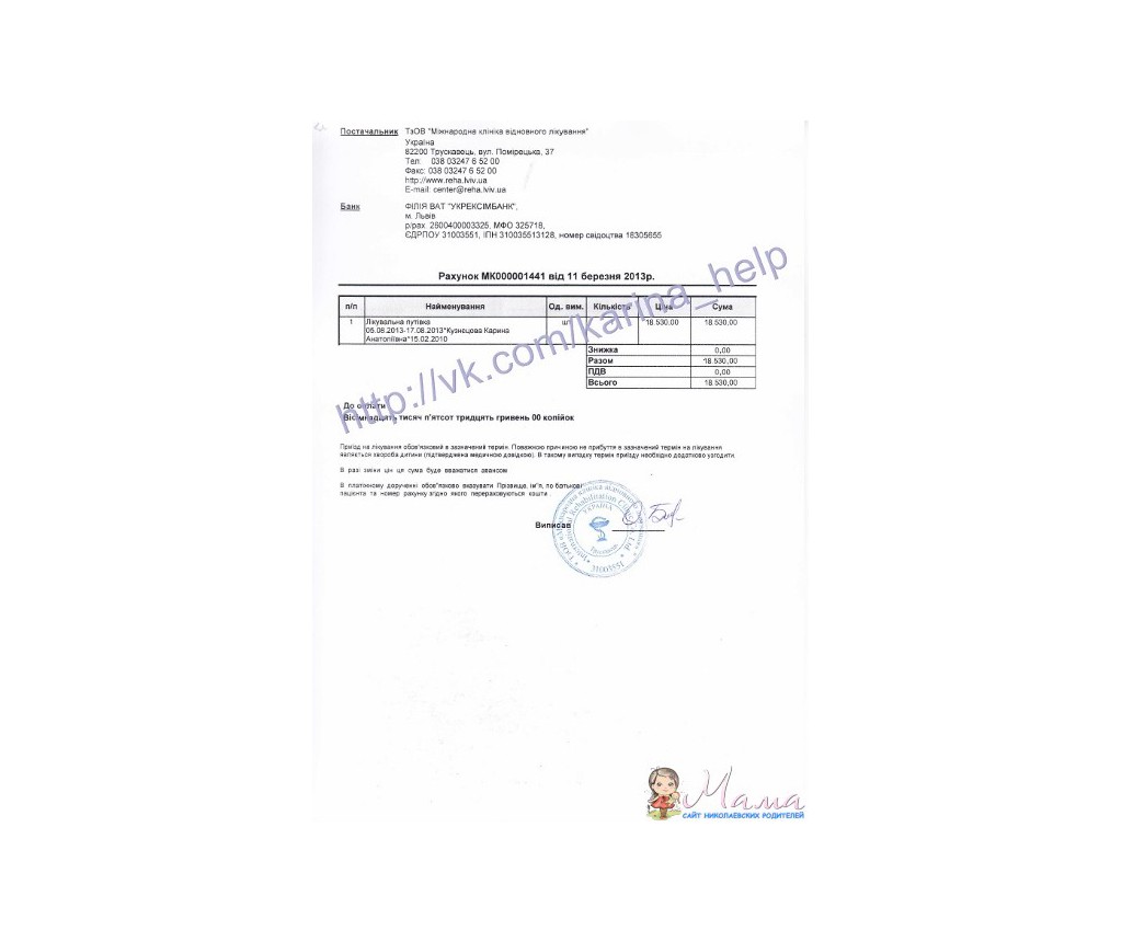 Сегодня я получила счет в Международную клинику восстановительного лечения Козявкина г.Трускавец