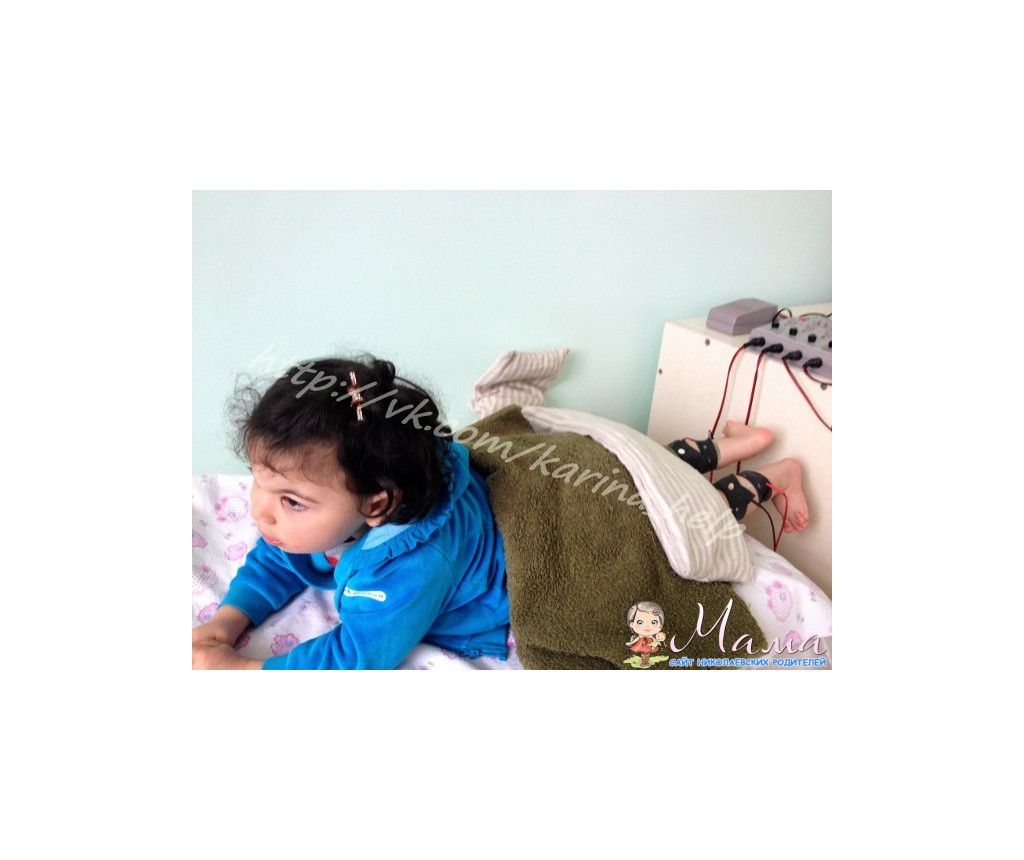 Единственный отрицательный момент, это то, что очень слабые коленки и голень. Когда Карина стоит на ножках, из-за слабости в коленках, они уходят назад...это очень плохо, поэтому нам показали какой комплекс упражнений нам необходимо делать дома, чтобы укрепить коленки, иначе в будущем это грозит операцией на суставах и этого допустить нельзя....!!!! В понедельник по этому вопросу проконсультируюсь еще с ортопедами. Также нам добавили еще одну процедуру, забыла точное название..)) но суть в том, что под воздействием тока, качаются мышцы голени...