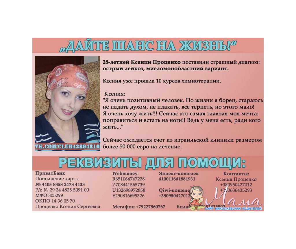 Очень нужна помощь молодой маме, Ксении Проценко, у нее рак крови!