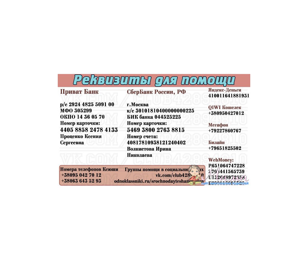 Вы можете перечислить любую посильную для Вас сумму на один из реквизитов (все счета принадлежат Проценко(Щиголь) Ксении Сергеевне: