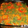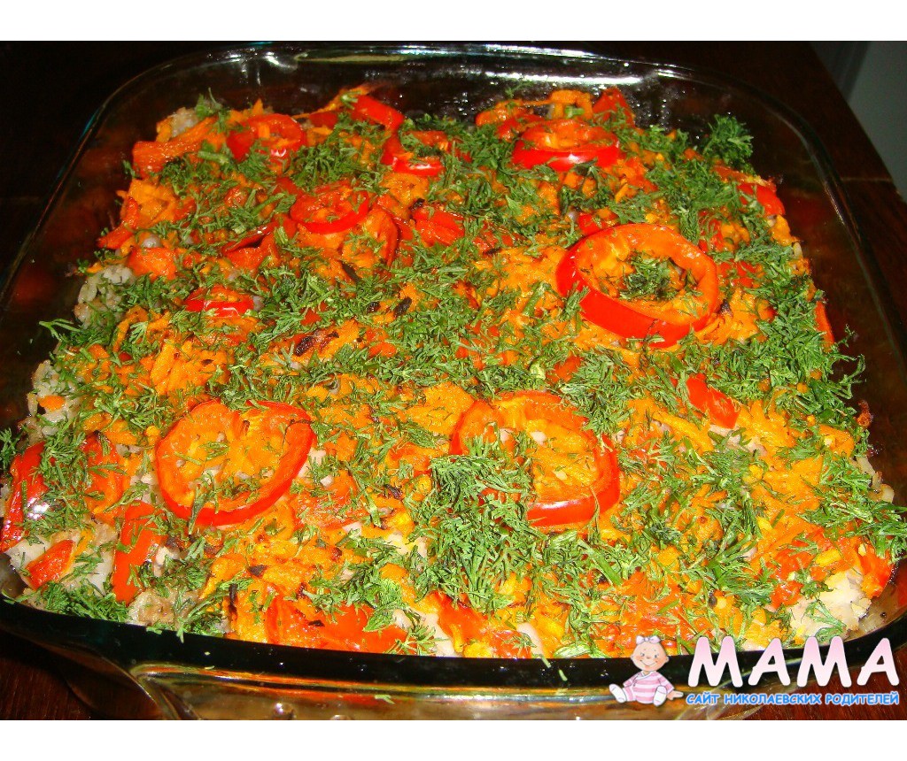 Форму смазать маслом, выложить слой риса, накрыть слоем овощей, украсить, запекать 15-20 мин при 180-200С.