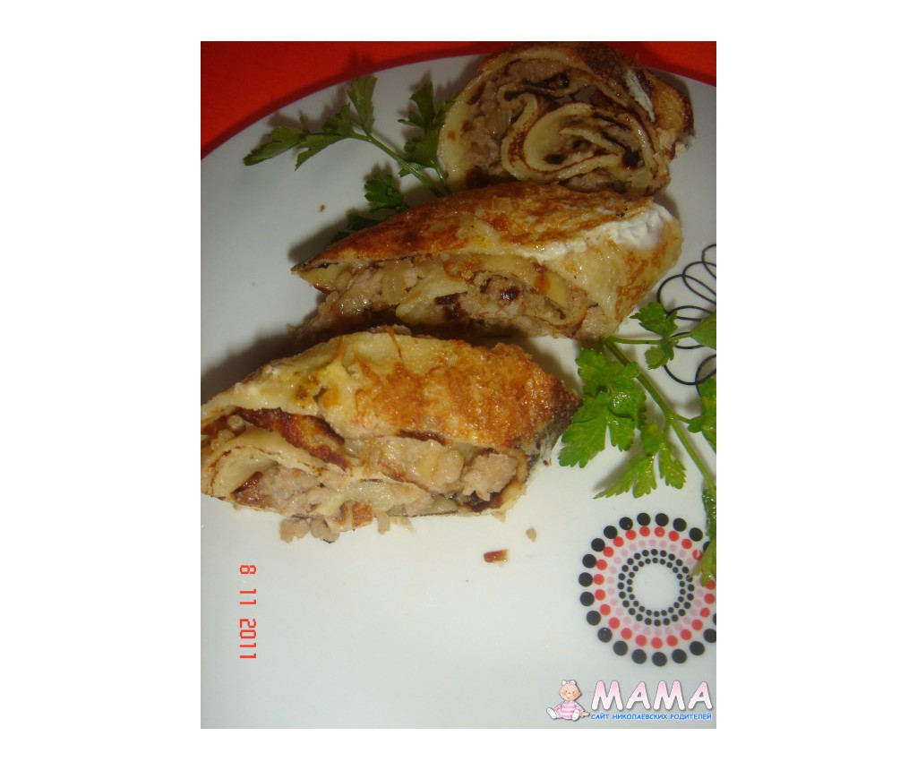 Нажарили блины, обжарили фарш с луком.Теперь на каждый блин выкладываем фарш, закручиваем в трубочку, обжариваем в кляре фаршированные блинчики..кушаем теплые!