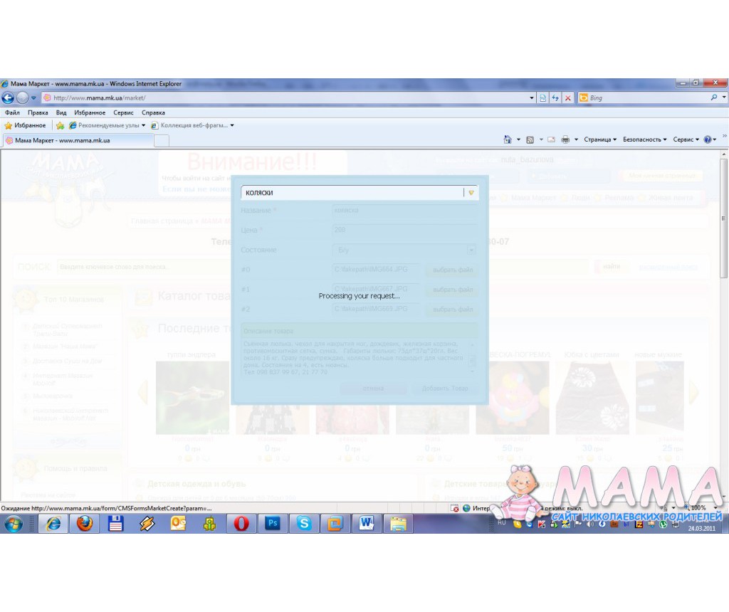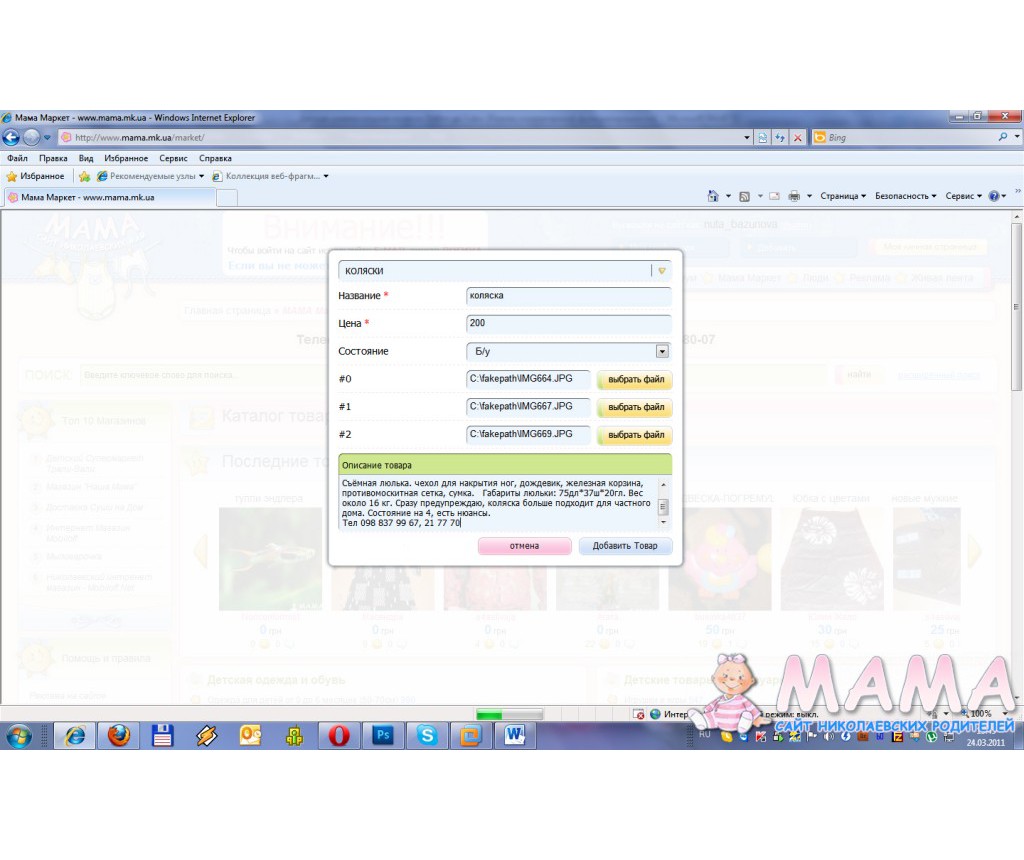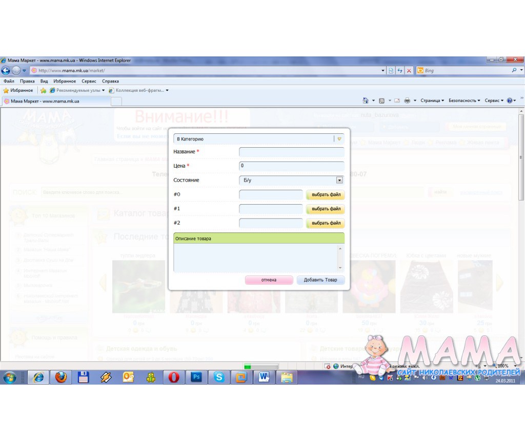 24 March 2011 Цитата: #6068 Энни 24 March 2011, 11:56добрый день, у меня не получается добавить товар! Это может быть связано с обновление мамамаркета? Раньше все получалось((( В чем загвоздка?