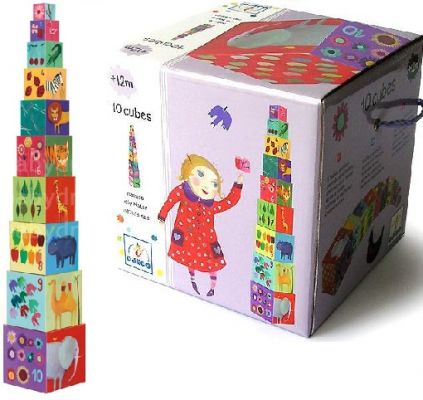 Каталочки могут быть на палочке или на веревочке, но однозначно нравятся всем деткам! А кубики у нас были из плотного картона, игрался ними учень долго, правда самый маленький из них почти сгрыз:) Покажу какие были у нас (наша любимая фирма Djeco), но аналоги можно найти и в других фирмах
