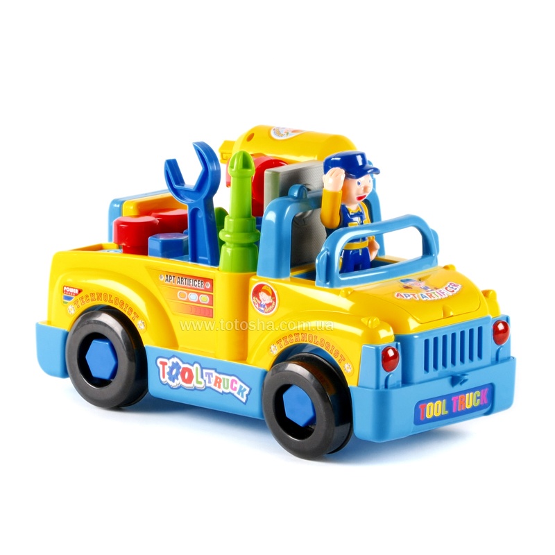 А нам бабушка с дедушкой такую машинку подарили: Tool truck разборная машинка с шуруповертом. В набор входит: фигурка водителя; шуруповерт (два различных наконечника); молоток; отвертка; гаечный ключ; 3 шурупа; 6 болтов; 2 гвоздя; крепежная пластина; тиски. Пластмассовая машинка-грузовичок Tool truck 789 с набором инструментов и шуруповертом на батарейках, при помощи которых возможно разбирать и собирать эту машинку. Машинка ездит отталкиваясь от препятствий, издает звук двигателя, проигрывает забавную песенку, фары светятся. Отличная игрушка. Сыночек с Нового года каждый день собирает-разбирает машину