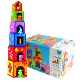 Классная!Кубики из плотного картона, сын строит из них башню, а потом старается засунуть каждое животное в домик (обычно все животные лезут в один домикМяffка