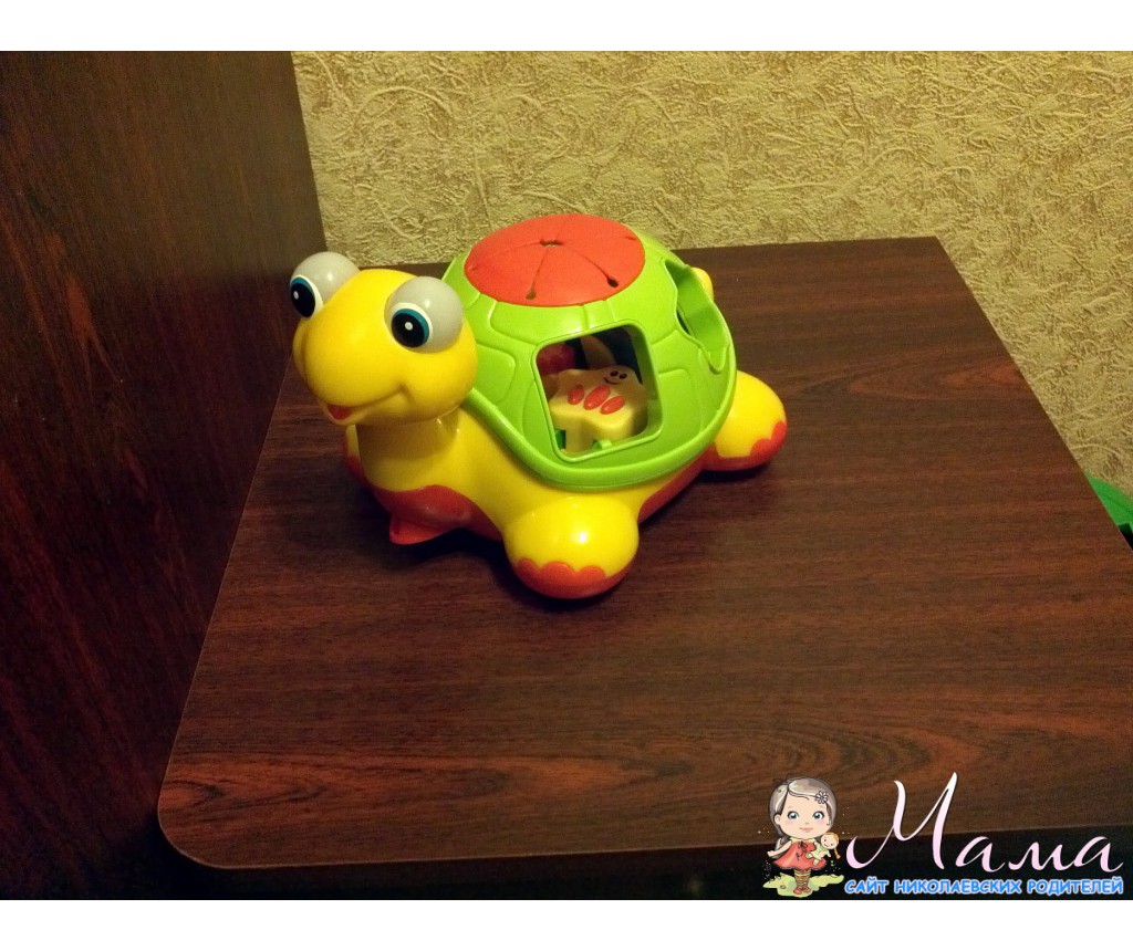 и киддиленд черепаха-сортер, у нас их две, одна просто музыку игиает, а вторая русифицированная, песенку поет и стишки рассказывает о фигурках, животных и цветах.