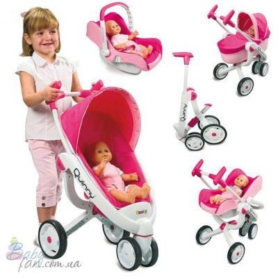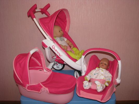 Пересмотрев много моделей и сайтов опять-таки вернулась к Smoby. Это вторая наша колясочка этой фирмы, первая была в виде люльки, удивительно, но на мой взгляд они хоть и одной фирмы, но отличаются качеством, как и ценой впрочем. Эта модель более крепкая, хороший пластик, метал.соединение, обшивка больше понравилась, колеса мягкие, в отличии от первой. Все легко ставится и снимается, у автокресла ручка регулируется в нужное положение, прогулочное сиденье можно ставить как лицом от мамы, так и к маме в положении лежа.