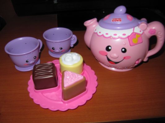 чаепитие музыкальное Fisher Price. Теперь мы очень любим пить чай и закусывать пирожными =) Чайничек поет песенки, наливает чай (когда его наклоняешь), в нем несколько режимов, очень довольны