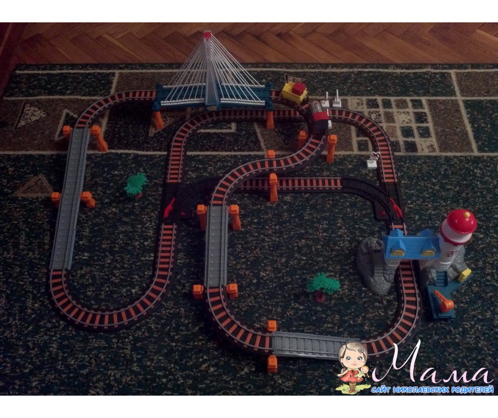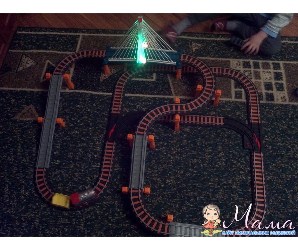 К нам дедушка приезжал и мелкий раскрутил на такую дорогу. Мост мигает, когда поезд по нему проезжает и станция издает звуки и эхо стука колес+ фонарь мигает.