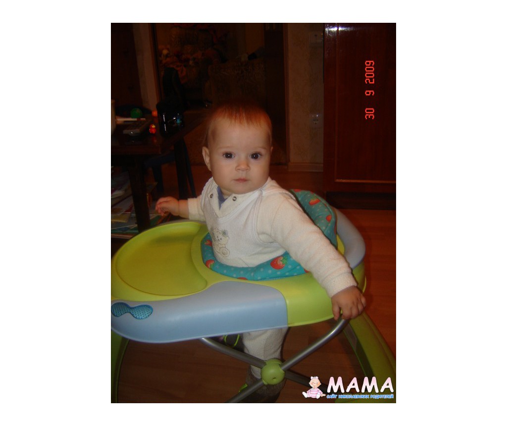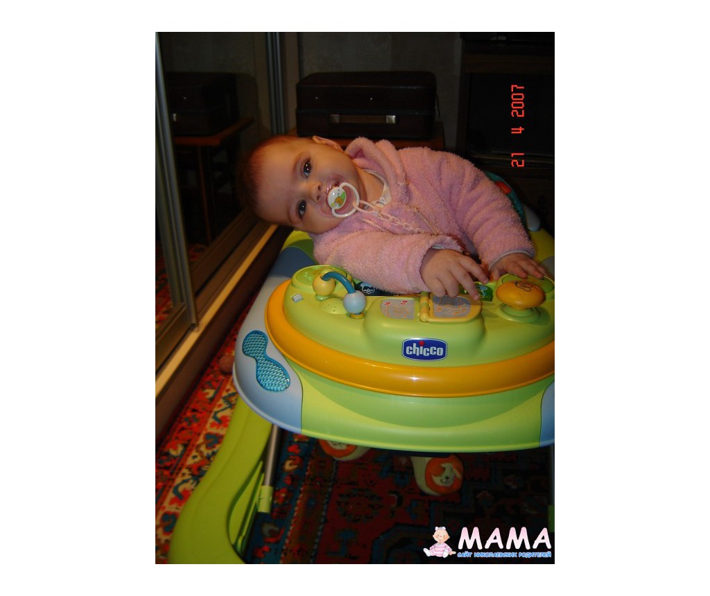 у нас ходунки были чьи-то, не помню даже чьи, и одни из самых простых, но служили немножко другой цели , Сашка уже сам ходил (он ходил с 10 мес), была осень, грязно, и у родителей в частном доме давало возможно ть ребенку летать по двору без опасности через каждый 3 мин переодеваться. а так..... Не особо они и помогают "научиться" ходить. Учились сами, без них, но было лето и было проще...зимой хуже ползать по полу((((((
