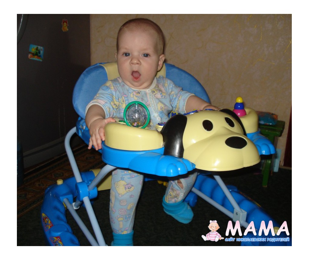 нам подарили ходунки в полгода...столешница с мордочкой собаки, много кнопок для воспроизведения разных (животных) звуков, рельсы-ножки можно было перестроить и получалось кресло-каталка...