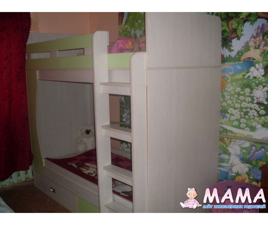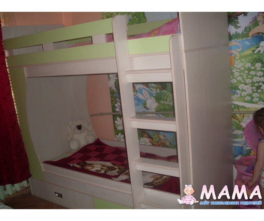 продаем свою двухэтажную, без матрасов, нижний ярус мягкий,типа диванчика, ДСП, лестница сбоку, не раскладывается на две кровати, нижний ярус без бортика, большой ящик внизу. 1000 грн