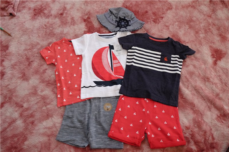 Футболочки 12-18, шортики 1,5-2 все село отлично, надеюсь, до начала сезона не перерастем)