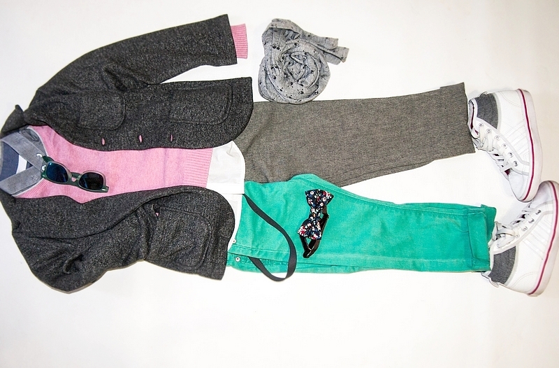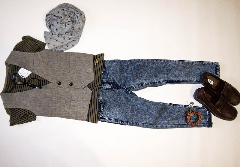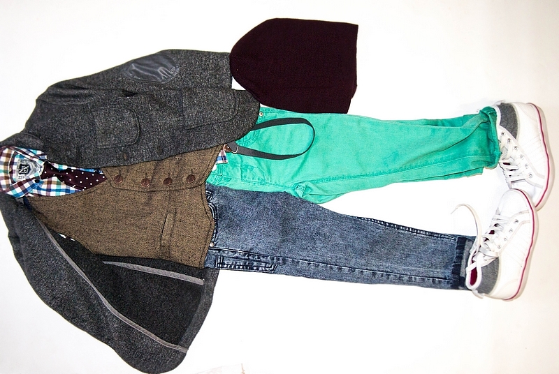Рубашка Некст, свитерок с v-вырезом Некст, пиджак Зара, джинсы Некст (подтяжки заровские) \ брюки Некст, хайтопы Адидас, шарф Зара, очки Гэп, бабочка хендмейл (покупная)