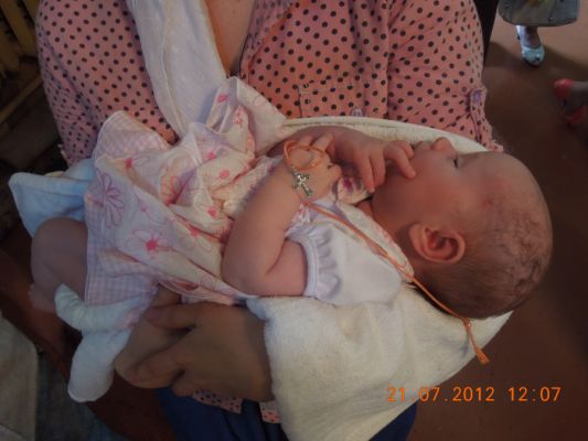 Мы крестились в конце июня,3недели от рождения было жарко)платье,пинетки вязали на заказ, но сняли по правилам