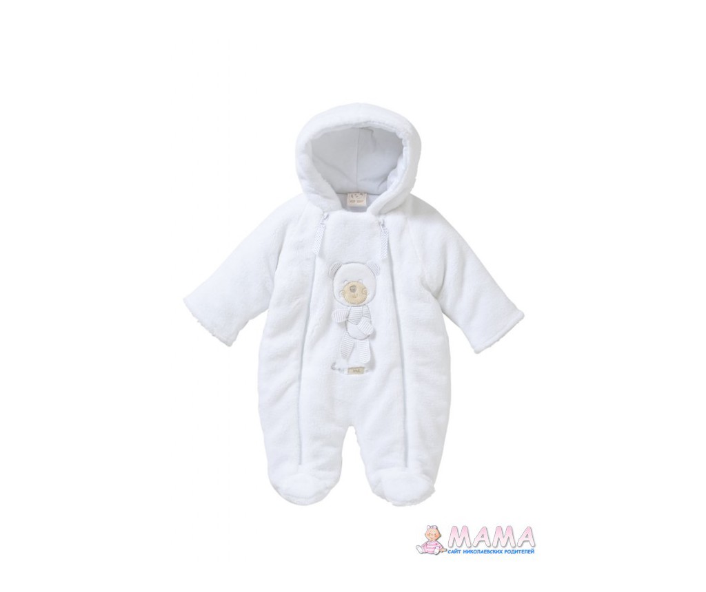 Наполнитель-натуральный гусиный пух. Пинетки отстегиваются, при этом ножки состегиваются конвертом. Это очень удобно, пока Ваш ребенок еще совсем маленький. Впереди 2 молнии, капюшон с ушками. Вышивка на грудке.