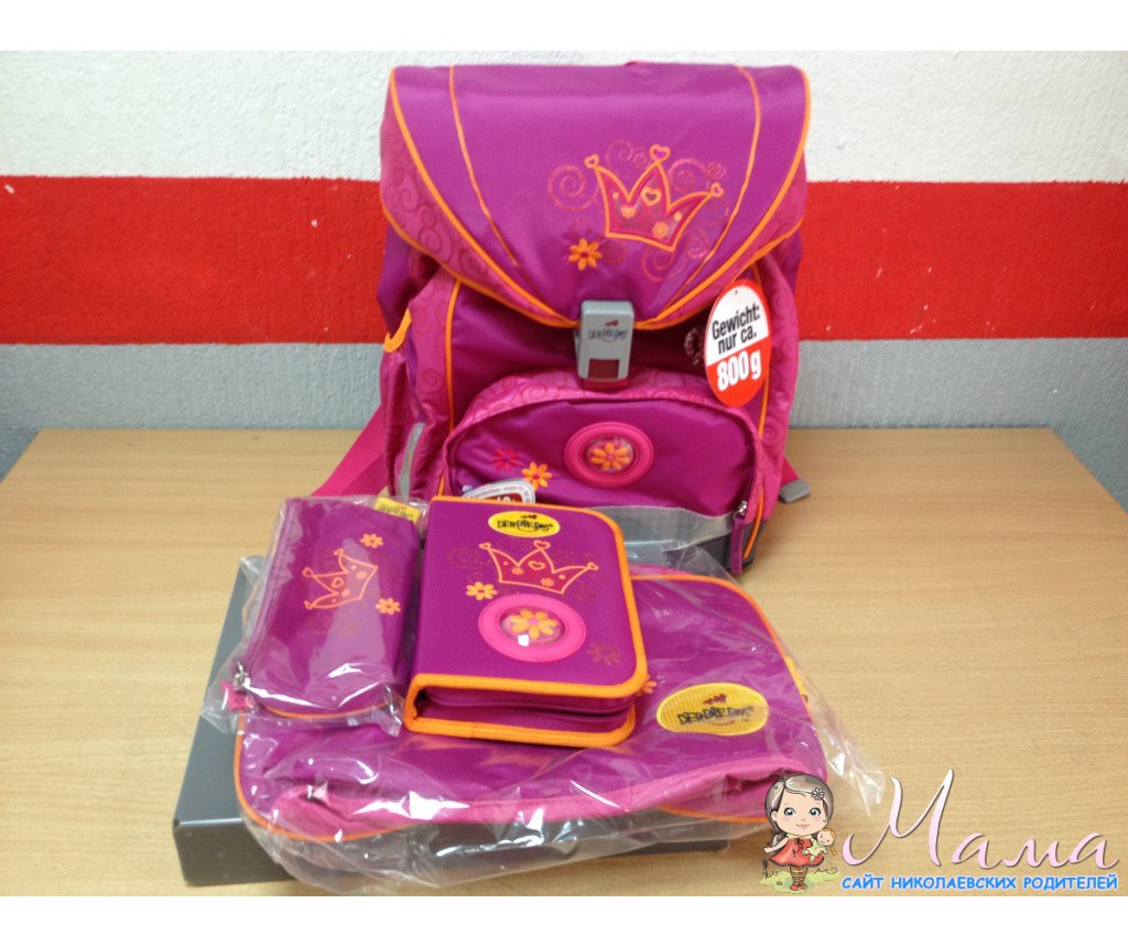 В комплект входит: школьный ранец DerDieDas, пенал с наполнением, нагрудный кошелек, спортивная сумка, пенал без наполнения.