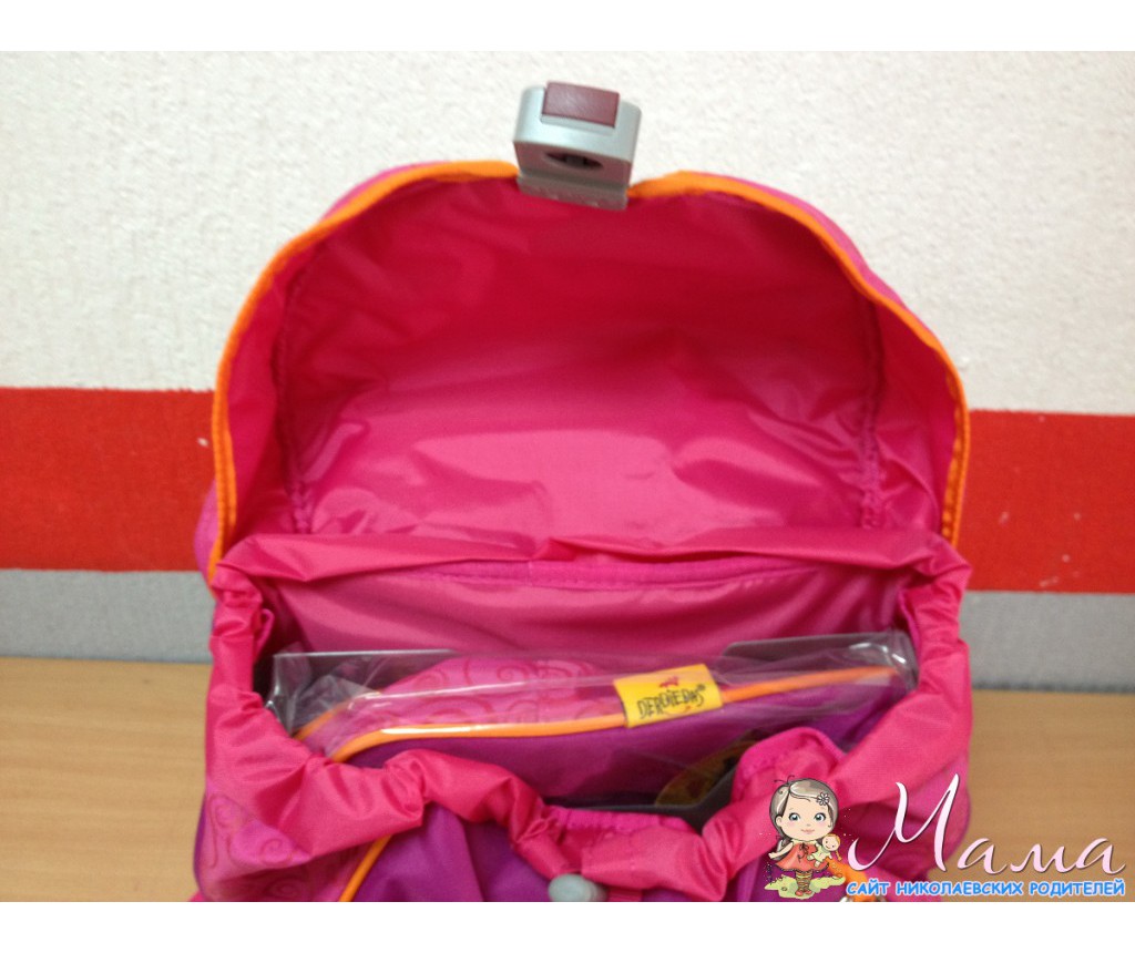 - Большое внутреннее отделение, дополнительный передний карман на молнии, отделение для расписания уроков, кармашек для мобильного телефона, кольцо для ключей, 2 боковых кармана для бутылочек с водой и бокса для завтрака.