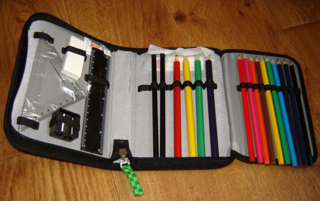 Взяла малому такой пенал на подготовишку - и очень удобно, с одной стороны у нас карандаши цветные, с другой - 2 простых, ручка, ластик, точилка, линейка