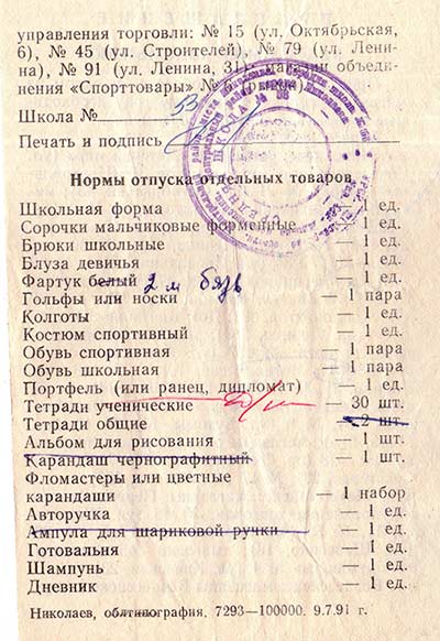 Сейчас, когда канцтовары в буквальном смысле на каждом углу в широчайшем ассортименте. А у меня сохранилась вот такая бумажка - ее выдавали в период распада СССР (эта из 1991 года) в школе под роспись. Это что и в каком количестве вы имели право купить на школьном базаре при условии, что вам вообще повезет найти эти товары в продаже и ваша очередь подойдет раньше, чем базар будет закрываться. То, что вычеркнуто, вам уже не продадут. Хотя, кажется, потом во время учебного года можно было докупить... не помню уже.