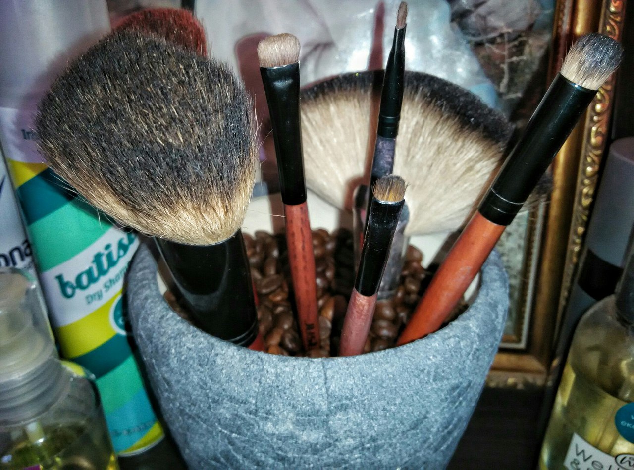Я сделала вот как, купила горшок для цветов, в цвет комнаты и насыпала туда кофе и теперь у меня там стоят кисти для макияжа. Главное, выбрать кофе с хорошим запахом)