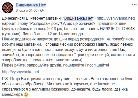 Распродажа у хорошего проверенного производителя. Качественный товар. Отшивают после акции долго, но можно накупить вышиванок просто за копейки!
