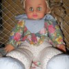 меняю куклу, старая еще моя, но я толком и не игралась) если ложить глаза закрываются, на ручках сердечки, при нажатии говорит мама, папа, смеется, плачет. работает от батареек.