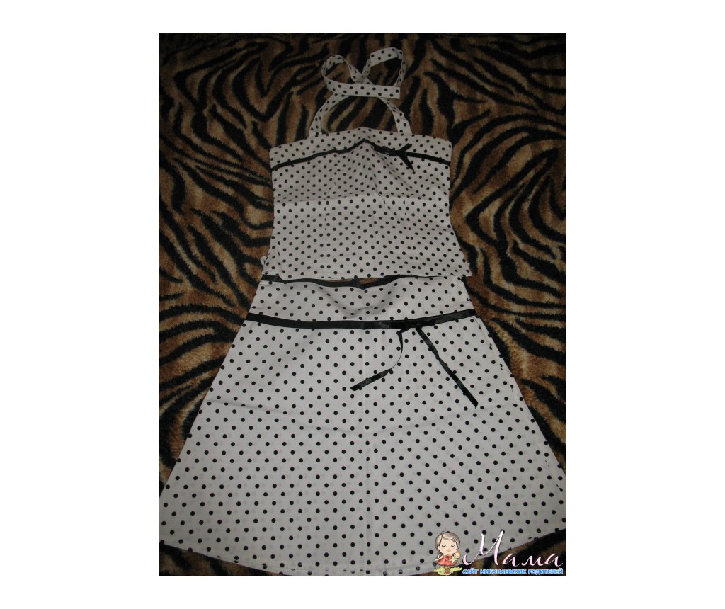 Меняю костюмчик для девочки, отличное состояние. Замеры: юбка – трапеция: талия 72см, бедра 90см. длина 45 см. топ на завязках, стрейчевый: грудь 72см, талия 72см, длина 36см.