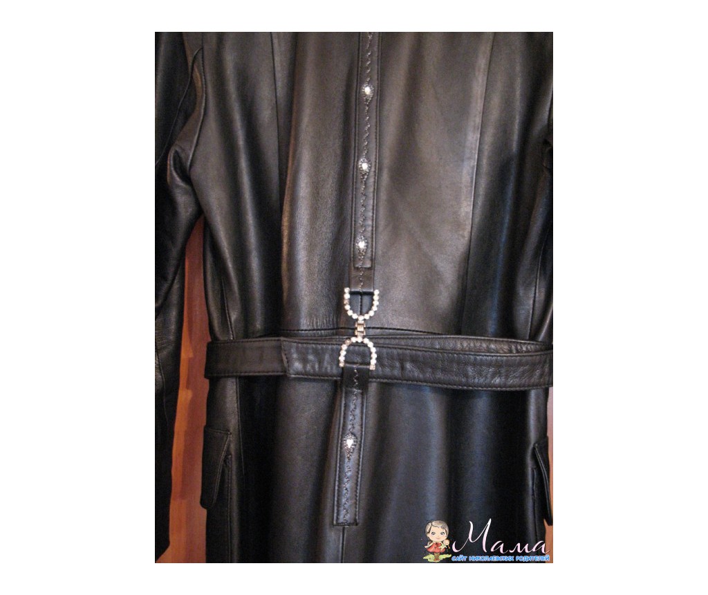 Плащ под пояс, два накладных кармана с заклепками со стразами, ворот - стойка, передняя планка вдоль змейки и спинка тоже отделана стразиками.