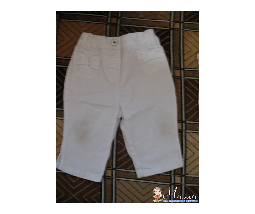 Штанишки белые Georg 12-18 мес. Замеры: шаг- 17см, длина- 35см, ширина по бедрам 27 см. Состояние нормальное (на коленях серые пятна от ползания – нужно постирать на высокой температуре).