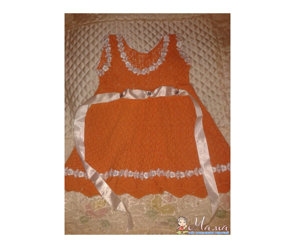Платье вязаное из х/б нити 12 мес. С белой атласной ленточкой, декорированной камешками на поясе. Очень хорошее качество, без кашлатостей, зацепок и других нюансов. Состояние отличное. Куплено в Москве. Замеры: ширина по подмышкам - 24см (за счет вязки платьице потянется), длина- 43-44см. Ссылка
