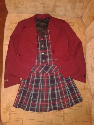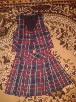 Школьная форма: пиджак, клетчатая юбка, жилетка бордовая, жилетка клетчатая, брюки черные.