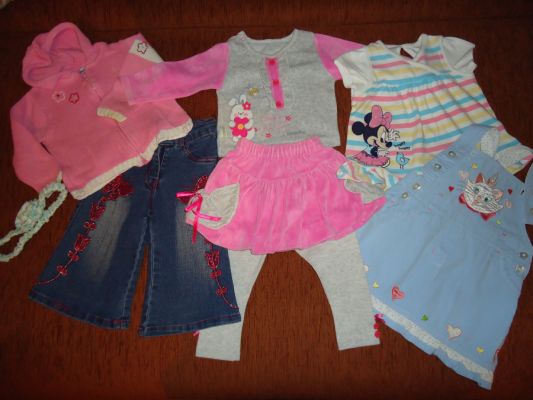 Вещи на 80-86 размер. Сарафан до 2-2,5 лет, юбка от костюма до 2,5 лет, леггинсы серые до 1,5 года как штанишки, потом чуть ниже колена, тунику до 2-х можно носить как кофточку. Джинсы и кофта на змейке на 1-1,5 года