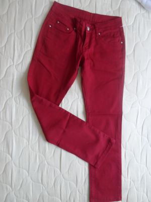 2. Джинсы бордовые 42 размера. Бирку сняла, но не носила. Не фирменные, но смотрятся прекрасно. Надо обрезать ниточки. В пуговичке и заклепках камешки. Состав: 65% cotton, 30% polyester, 5% elastane.