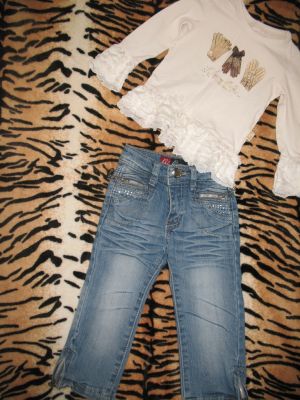 Моднявые Реглан и джинсы на 18 мес. Реглан куплен в Италии, отличное качество, мягусенький трикотаж, отделка рукавов и низа рюшами с золотистыми вкраплениями, рисунок подчеркнут стразами, все стразики на месте!!! Состояние идеальное. Замеры: длина 32см, рукав от плеча 29см, рукав по внутреннему шву 23см, ширина по подмышкам 26см. Джинсики Glamo-urr GJ все кармашки и спереди и сзади оформлены змейками с декоративными цепочками и стразами, карманы отсторочены, спереди есть фактурные «заломы». Состояние отличное. Замеры: длина 47см, шаговый шов 29см, полуобхват талии 24см. В комплекте смотрятся очень стильно. Ваша крошка будет неотразима.