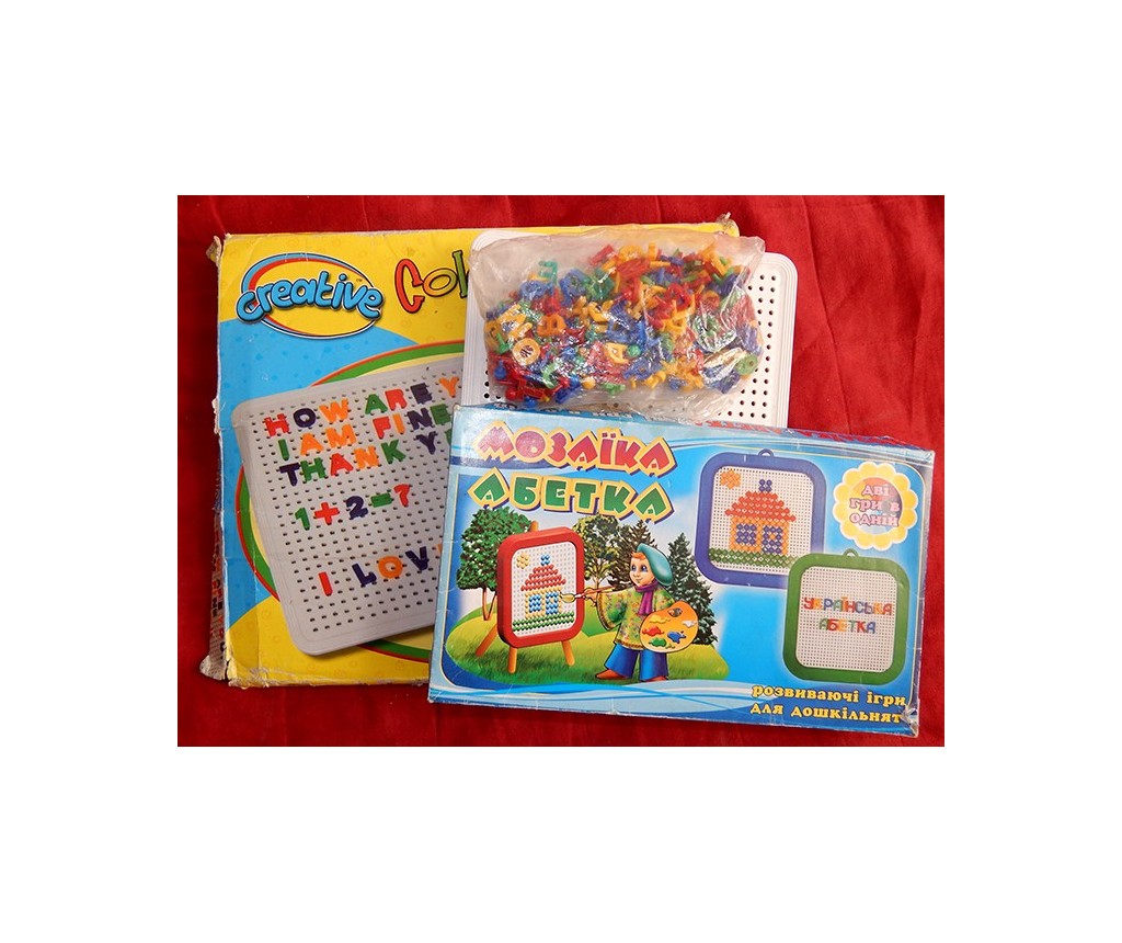 Мозаика - тут два набора. Большое поле и маленькое. Простые фишечки, украинский алфавит и английский. Для тех, кто доверяет своему ребенку, т.к. детальки ОЧЕНЬ мелкие.
