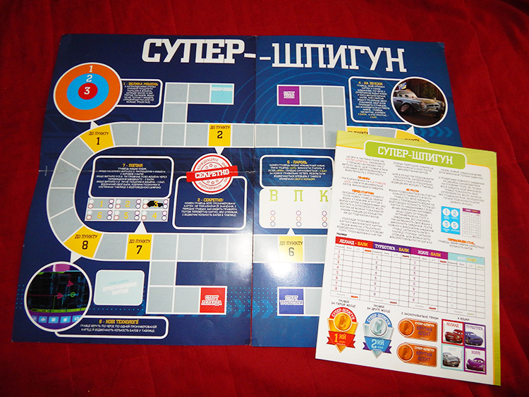 2. Игра "Тачки Супершпион", к ней прилагается целый буклет с правилами, мы не смогли и не захотели в них въехать. Это не просто бродилка, а с карточками, где-то от 6 лет, потребуется помощь взрослых.